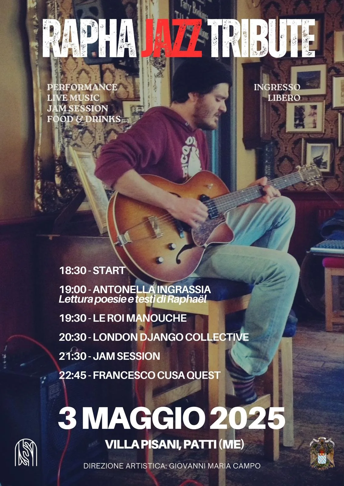 An experiential performance with some Rapha’s poetry readings by a local artist, Antonella Ingrassia, will open the event. The first part of the Concert will celebrate Raphaël’s involvement in Gypsy Jazz with two quartets, the “London Django Collective” and “Le Roi Manouche”, from Messina. After the respective performances, they will come together in a big jam session that will include local talented young musicians.