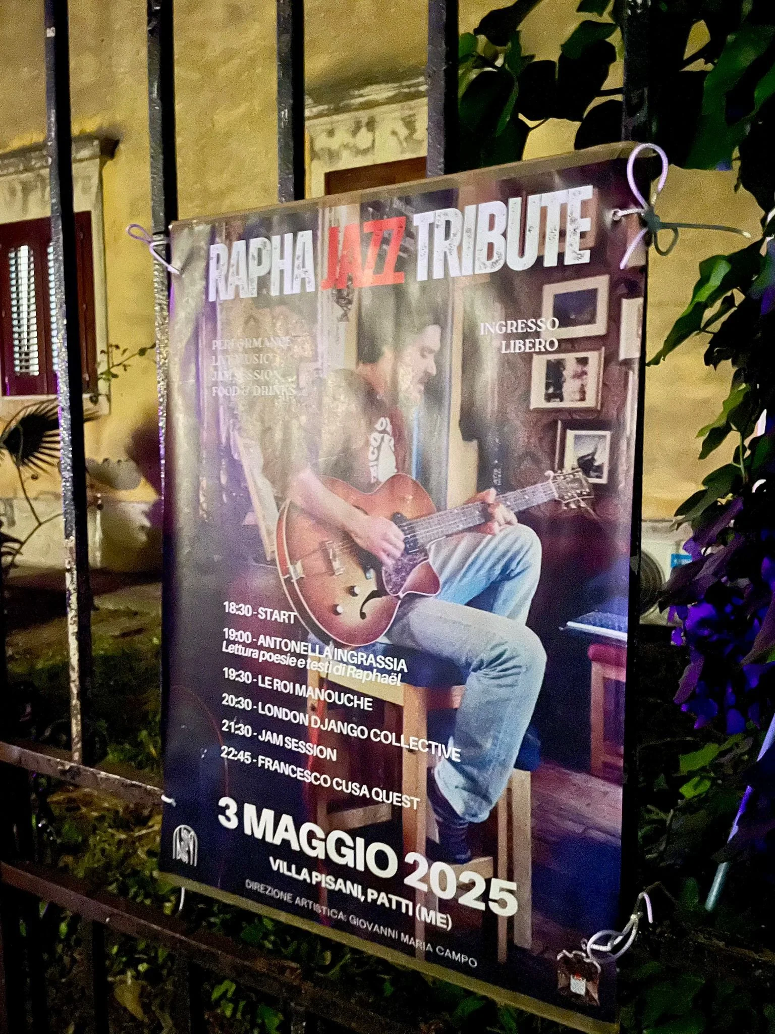 Maria Sgroi e Bernard Dufresne, in collaborazione con l’associazione ed il collettivo Umana, hanno organizzato a Patti, sabato 3 maggio 2025, un Concerto Tributo in memoria del musicista Raphaël Dufresne, cui il Centro culturale di via teatro è dedicato. L’evento ha avuto il patrocinio del Comune di Patti che ha messo a disposizione per l’evento il giardino di Villa Pisani.